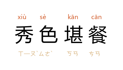 秀色:美女的姿容或自然的美景;堪:可;餐:吃。形容女子容貌秀丽动人或景色非常美。