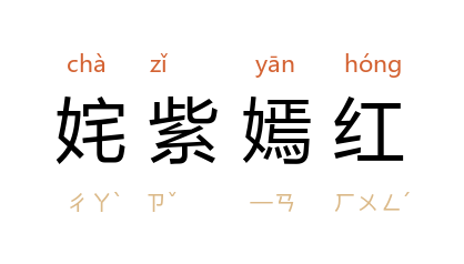 姹:美丽;嫣:妖艳;美好。形容各色的美丽花朵争相斗妍。也作“嫣红姹紫”。