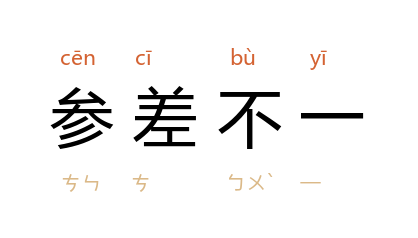 出处《南齐书 礼志上》:“至于嗣位之君,参差不一,宜有定制。”《隋书 后妃传》:“周公定礼,内职始备列焉。秦、汉以下,代有沿革,品秩差次,前史载之详矣。齐、梁以降,历魏暨周,废置益损,参差不一。”