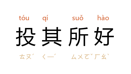 投合对方的爱好;有巴结讨好的意味。投:投合;迎合;好:爱好;喜好;所好:喜好的事物。