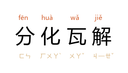 瓦解:制瓦时先用陶土制成圆筒形;再分部为四片;即成瓦。使对方的力量分裂、离散。