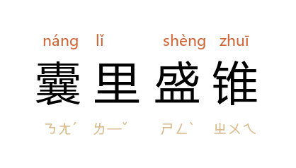 出处《史记·平原君虞卿列传》:“平原君曰:‘夫贤士之处世也,譬若锥之处囊中,其末立见……’毛遂曰:‘臣乃今日请处囊中耳。使遂早得处囊中,乃颖脱而出,非特其末见而已。’”