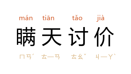 出处清 吴敬梓《儒林外史》第14回:“这个正合着古语,‘瞒天讨价,就地还钱’,我说二三百银子,你就说二三十两!”