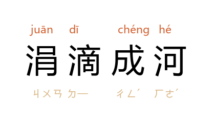 涓滴:小水珠。一点一滴的水珠汇集起来就可以成为河流。形容积少成多。