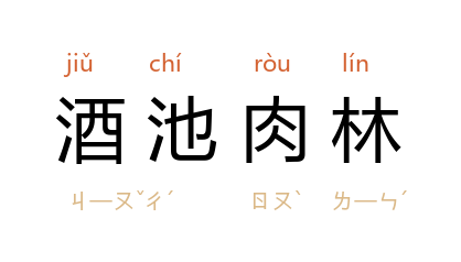 古代传说,殷纣以酒为池,以肉为林,为长夜之饮。原指荒淫腐化、极端奢侈的生活,后也形容酒肉极多。