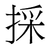 《唐韻》倉宰切《集韻》《韻會》《正韻》此宰切,𠀤同采。摘也,取也,㩜也。《戰國策》芻牧薪採,莫敢闚東門。《註》大者薪,小者採。《晉書·劉琨傳》古語云:山有猛獸,藜藿爲之不採。《唐書·地理志》開元二十一年,置十五採訪使檢察,如漢刺史之職。◎按採本从爪从木,爪即手也。後人又加手作採。