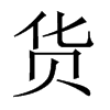 〔古文〕䞈𣱷《唐韻》《集韻》《韻會》《正韻》𠀤呼臥切,火去聲。《說文》財也。《廣韻》貨者,化也。變化反易之物,故字有化也。《易·繫辭》日中爲市,致天下之民,聚天下之貨,交易而退。《書·洪範》八政,二曰貨。《傳》貨,寶用物。《周禮·天官·大宰》商賈阜通貨賄。《註》金玉曰貨。《前漢·食貨志》貨,謂布帛可衣及金刀龜貝,所以分財布利通有無者也。