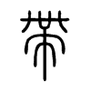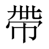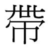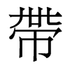 《唐韻》《集韻》《韻會》《正韻》𠀤當蓋切,音㯂。《說文》紳也。男子搫帶,婦人帶絲,象繫佩之形。佩必有巾,故帶从巾。《徐鉉曰》卌,其帶上連屬固結處。《釋名》帶,蔕也。著於衣,如物之繫蔕也。《易·訟卦》或錫之鞶帶。《疏》鞶帶大帶也。《禮·玉藻》凡帶有率,無箴功。《疏》謂其帶旣襌,亦以箴緶緝其側,但繂襵之,無別裨飾之箴功。