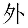 〔古文〕𡖄《廣韻》《集韻》五會切《韻會》魚會切,𠀤歪去聲。內之對,表也。《易·坤卦文言》義以方外。《家人彖傳》男正位乎外。《禮·祭義》禮也者,動於外者也。《莊子·齊物論》六合之外,聖人存而不論。《列子·仲尼篇》遠在八荒之外。