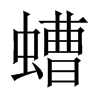〔古文〕𧕐《唐韻》昨勞切《韻會》《正韻》財勞切,𠀤音曹。《爾雅·釋蟲》蟦,蠐螬。《註》在糞土中者。《莊子·至樂篇》烏足之根爲蠐螬。《本草》一名乳齊,一名地蠶,一名應條,大者如足大指,以背滾行。《說文長箋》曹,猶官曹,言多也,故从曹。