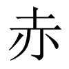 (1) (会意。甲骨文,从大(人)从火。人在火上,被烤得红红的。一说“大火”为赤。本义:火的颜色,即红色)