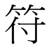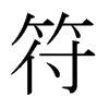 《廣韻》防無切《集韻》馮無切《正韻》逢夫切,𠀤音扶。《說文》符,信也。漢制以竹,長六寸,分而相合。《釋名》符,付也。書所敕命于上,付使傳行之也。《玉篇》符,符節也。分爲兩邊,各持一以爲信。《篇海》符者,輔也,所以輔信。