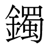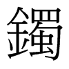 《唐韻》《集韻》《韻會》《正韻》𠀤直角切,音濁。《說文》鉦也。从金蜀聲。軍法,司馬執兩鐲。《周禮·地官·鼓人》以金鐲節鼓。《註》鐲,鉦也。形如小鍾,軍行鳴之,以爲鼓節。《釋文》鐲,直角反。