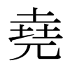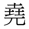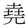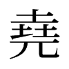 〔古文〕𡋰《廣韻》五聊切《集韻》倪幺切,𠀤音僥。《說文》高也。从垚,在兀上。高遠也。《白虎通》堯猶嶢也。嶢嶢,至高貌。古唐帝。《書·堯典》曰若稽古帝堯。