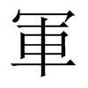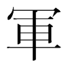 圜圍也。四千人爲軍。从車,从包省。軍(車),兵車也。舉云切〖注〗𡗽,古文。