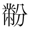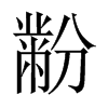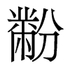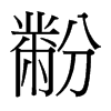《唐韻》方吻切《集韻》府吻切,𠀤音粉。《說文》袞衣山龍華蟲黺畫粉也。《玉篇》黺,綵也。一作粉米。《書·益稷》藻火粉米,黼黻絺繡。《傳》粉若粟氷,米若聚米。《釋文》粉米,說文作黺𪓋。