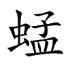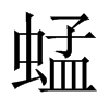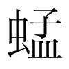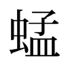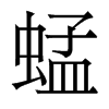 《集韻》《韻會》《正韻》𠀤母梗切,音猛。蚱蜢,蝗類,似螽而小。《本草》𧒂蟲,一名蚱蜢。《六書正譌》蚱蜢,草上蟲也。