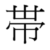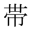 《唐韻》《集韻》《韻會》《正韻》𠀤當蓋切,音㯂。《說文》紳也。男子搫帶,婦人帶絲,象繫佩之形。佩必有巾,故帶从巾。《徐鉉曰》卌,其帶上連屬固結處。《釋名》帶,蔕也。著於衣,如物之繫蔕也。《易·訟卦》或錫之鞶帶。《疏》鞶帶大帶也。《禮·玉藻》凡帶有率,無箴功。《疏》謂其帶旣襌,亦以箴緶緝其側,但繂襵之,無別裨飾之箴功。