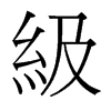 (級)絲次弟也。本謂絲之次弟。故其字从糸。引申爲凡次弟之偁。階之次弟。曲禮云拾級聚足連步以上是也。尊卑之次弟。賈生云等級分明而天子加焉、故其尊不可及是也。後漢書注。秦法斬首多者進爵一級。因謂斬首爲級。从糸。及聲。居立切。七部。