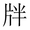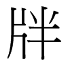 《廣韻》《集韻》《韻會》《正韻》𠀤普半切,音泮。《玉篇》半也,分也。《楚辭·九章》背膺牉以交痛兮,心鬱結而紆軫。