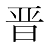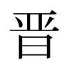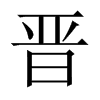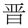 《正字通》俗㬜字。(晉)《唐韻》《集韻》《韻會》𠀤卽刃切。《說文》作㬜,進也,日出萬物進也。《類篇》隸省作晉。《易·晉卦》晉,進也。《疏》以今釋古,古之晉字,卽以進長爲義。《又》明出地上晉。