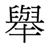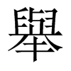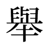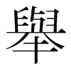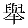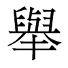 (擧)對舉也。對舉謂以兩手舉之。故其字从手與。𠂇手與又手也。从手。與聲。居許切。五部。一曰輿也。小徐有此四字。按輿卽舁。轉寫改之。左傳。使五人輿豭從己。舁之叚借也。舁者、共舉也。共者、非一人之辭也。舉之義亦或訓爲舁。俗別作?羼入說文。音以諸切。非古也。
